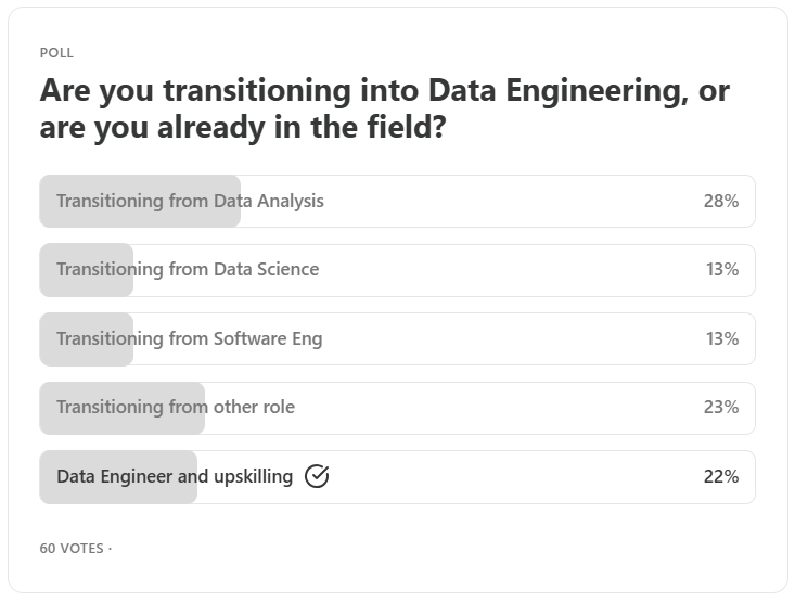 In our previous post, one of the co-founders of Pipeline To Insights shared his reason for transitioning into data engineering. We also conducted a poll, and based on the results, we've decided to write this post specifically for data analysts and professionals in similar roles looking to switch to data engineering.
