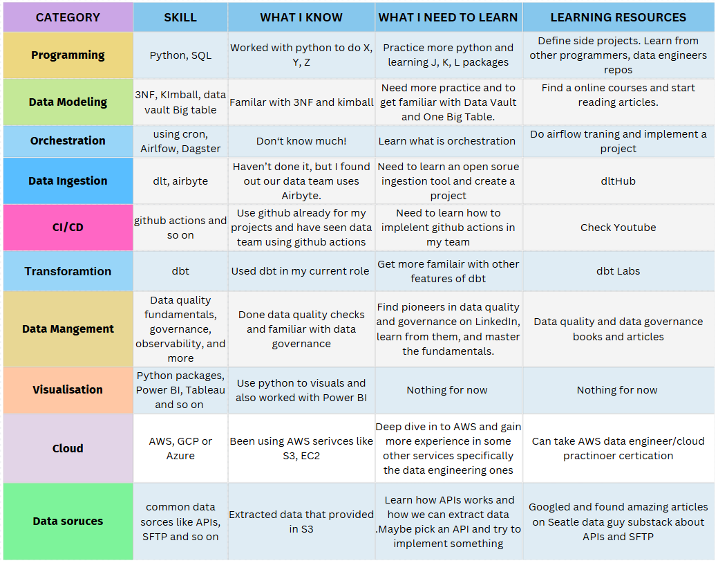 Based on what you’ve learned and understood from previous stages, it’s now time to organise your thoughts and create a concrete plan with actionable steps. Here's a template I use to assess my own skills, determine my proficiency level, and identify the gaps between my current skills and those required for a data engineering role.