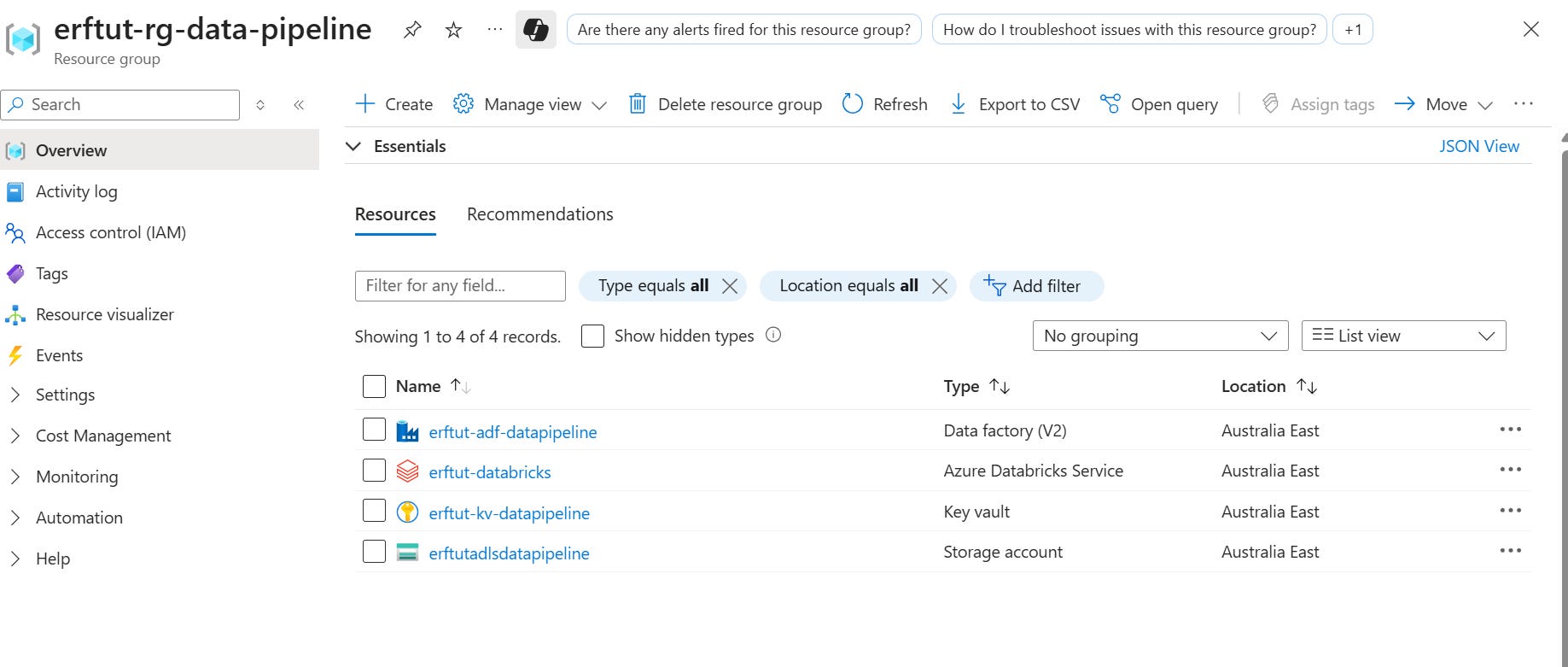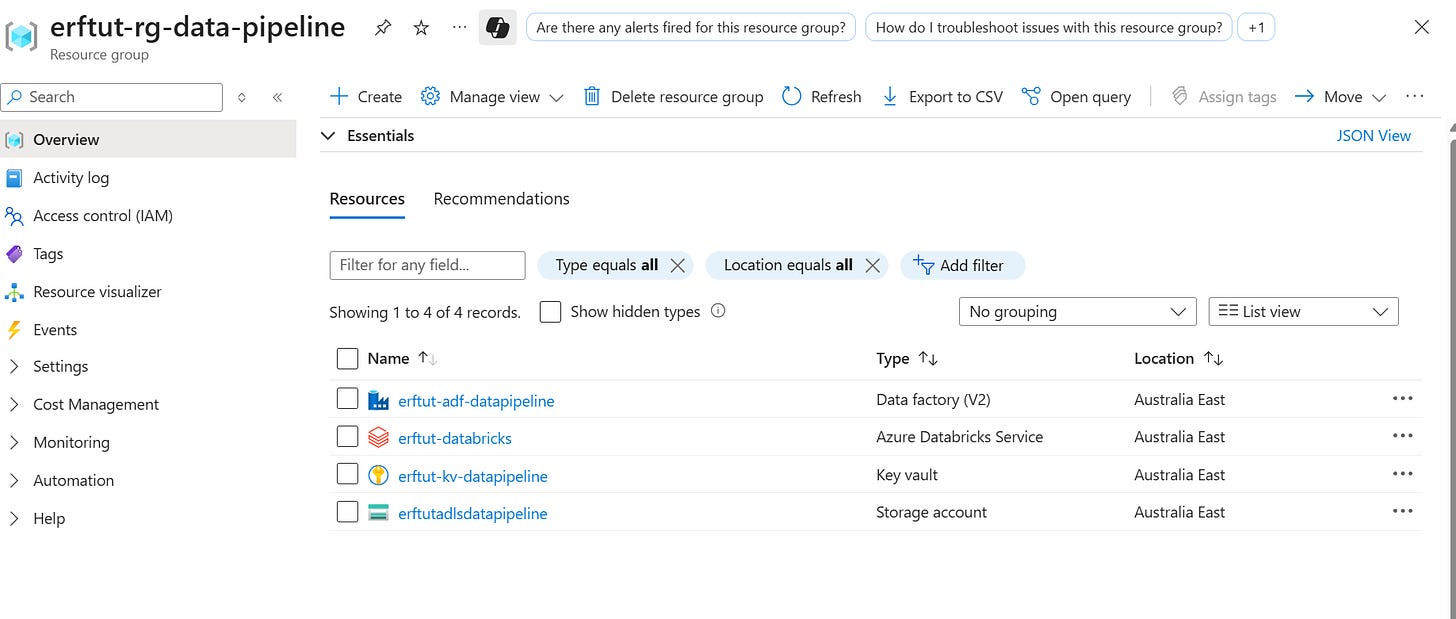 Assume we already have ADLS, ADF, a database, and a Key Vault set up. Now, we want to add Azure Databricks.