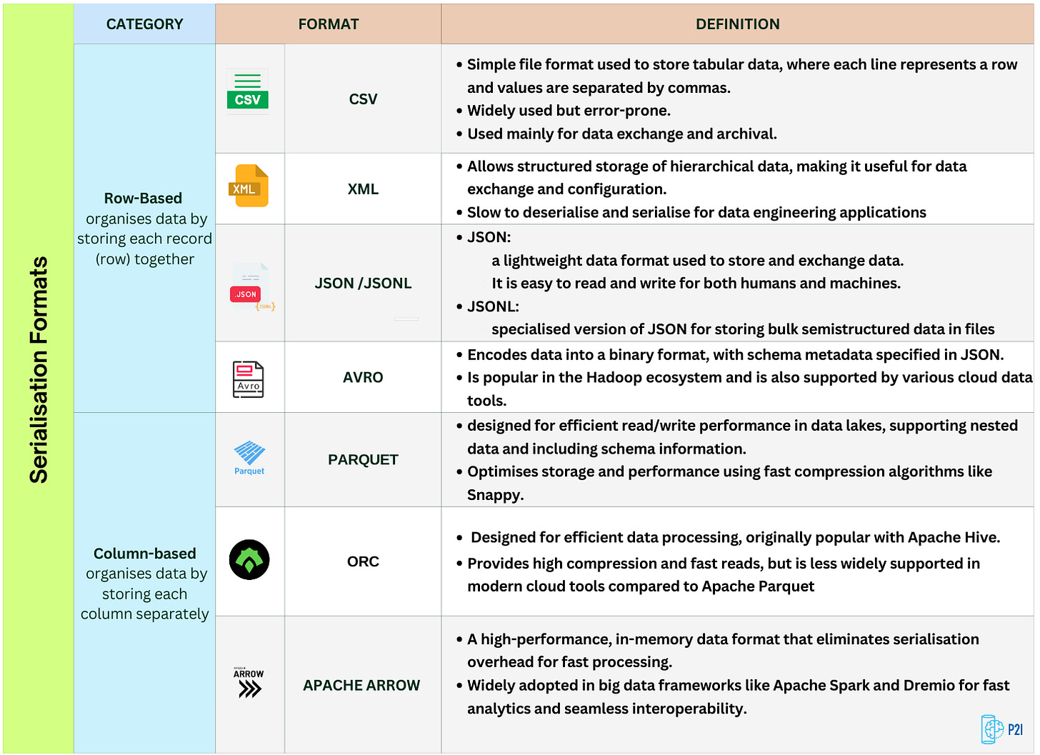 Serialisation formats vary from human-readable text formats like CSV, XML, and JSON, to efficient binary formats like Avro and Parquet, which are optimised for storage and querying.