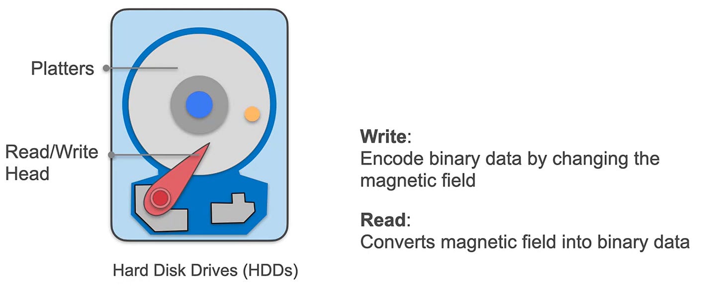Magnetic disks: also known as hard disk drives (HDDs), store data on spinning platters coated with magnetic film and work much like old record players. A small read/write head moves to the correct track as the platter spins, with each platter divided into tracks and sectors that create unique addresses for storing and retrieving data. Writing occurs when the head changes the magnetic field to record 1s and 0s, while reading happens when it detects those fields and converts them into bits. Since they rely on moving parts, HDDs are slower and wear out more easily, but they are usually cheaper and well-suited for storing large amounts of data.