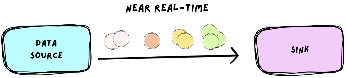 Near real-time processing aims to reduce the delay between data creation and data insight, without diving into the full complexity of streaming systems.