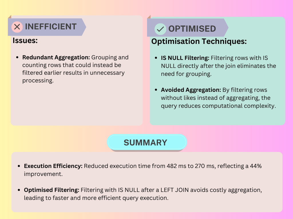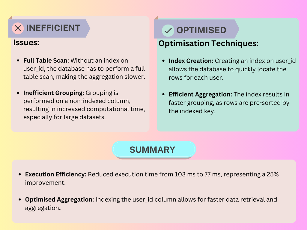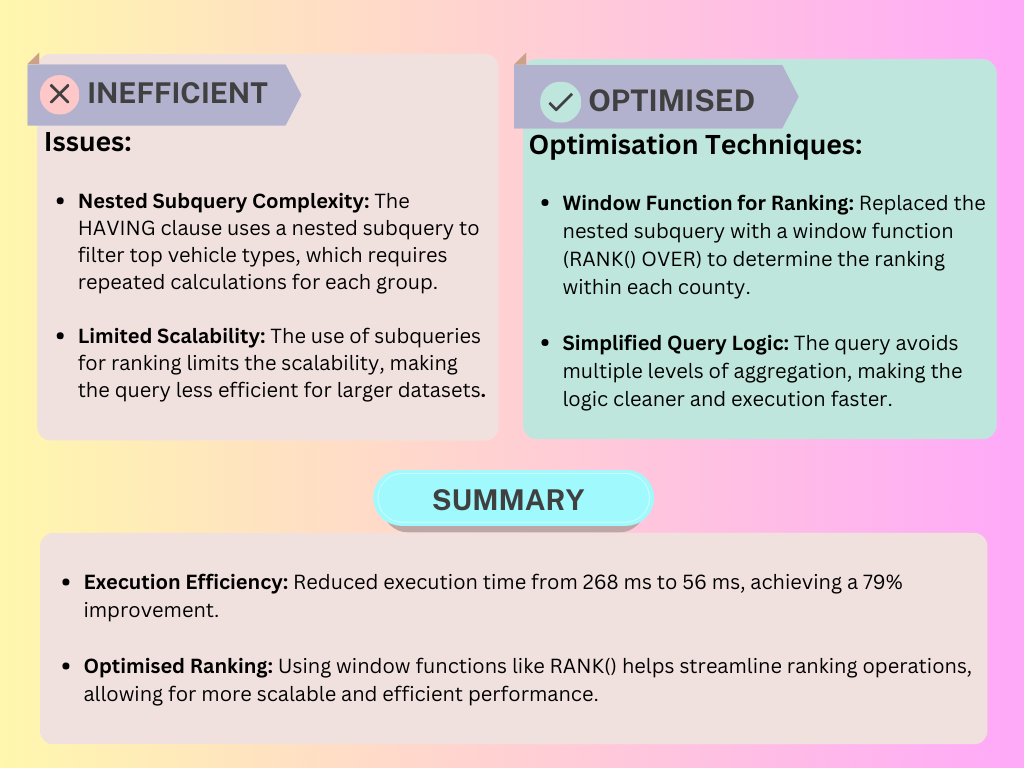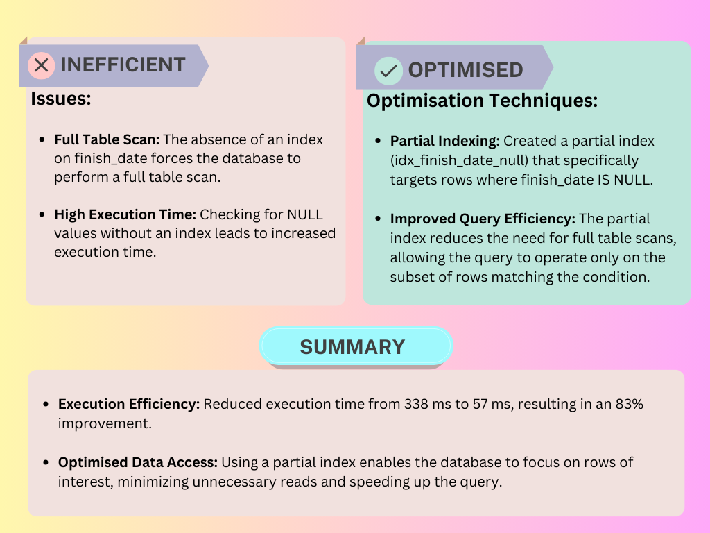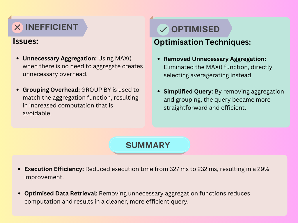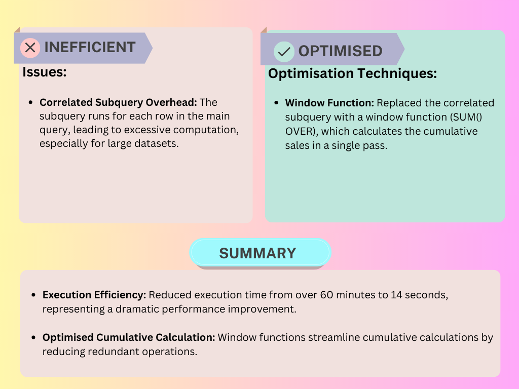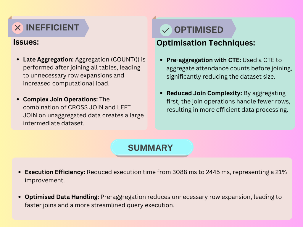 These optimisations significantly reduced execution times, making our queries faster, cleaner, and more maintainable.