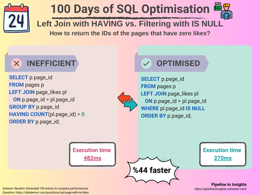 Day 24: Left Join with HAVING vs. Filtering with IS NULL