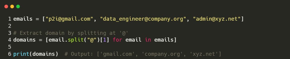 In the following snippet, we split each email at the '@' symbol to extract the domain name: